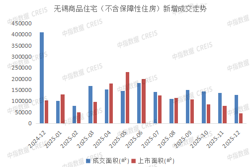 2025年12月,梁溪区成交最多,成交3.00万㎡;滨湖区新增最多,供应3.54万㎡。