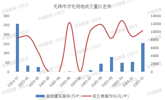 2025年1-12月,无锡市(含江阴、宜兴)共成交各类用地283宗,规划建面共计1626.48万㎡。其中,成交住宅用地66宗,共计450.92万㎡;商办用地36宗,共计122.73万㎡。