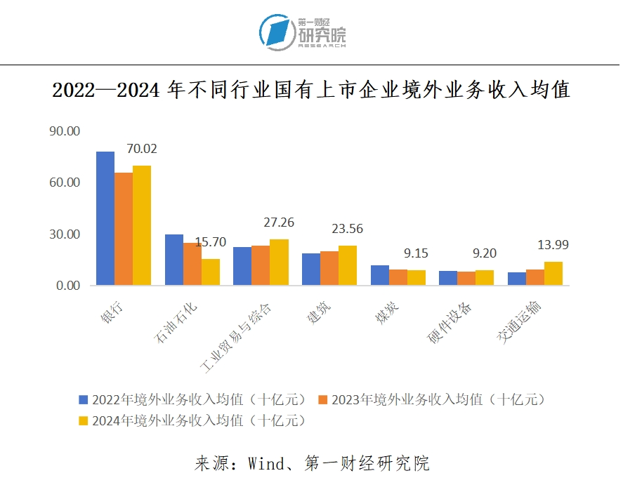 文献《战略、管理、风控及本地化——国企出海的破局之路》显示,2005—2021年,国有企业出海主要集中于重资产行业,如能源、原材料、交通等。我们根据Wind二级行业分类,观察不同行业国有上市企业的全球化销售表现,得到了类似的结论。2022—2024年,银行、石油石化、工业贸易与综合、建筑、煤炭、硬件设备以及交通运输行业的上市国有企业境外业务收入均值均高于总体上市国有企业境外业务收入的平均水平。这些行业的国有上市企业在海外销售方面表现突出。