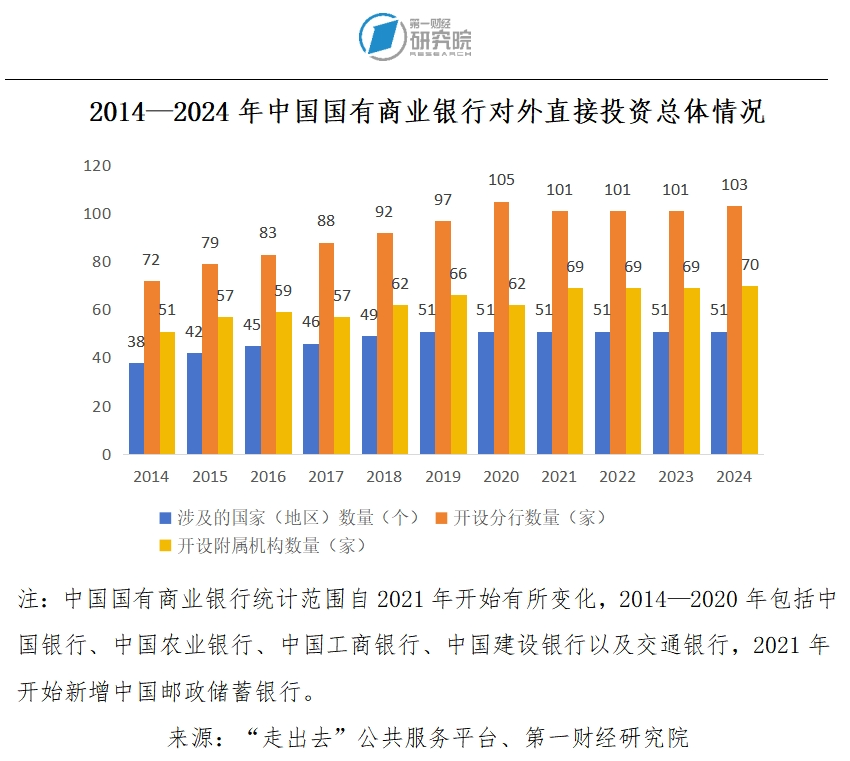 除此之外,2014—2020年,中国国有商业银行持续进行海外投资,广泛布局,海外服务能力持续增强。2020年末,中国国有商业银行在海外开设分行数量由2014年末的72家上升至105家。在中国邮政储蓄银行加入统计样本后的2021—2024年,国有商业银行的海外投资布局则没有太大的变化。这些银行的海外本土化经营同样值得关注。2021—2024年数据显示,这些国有商业银行雇佣外方员工占比维持在92%以上。