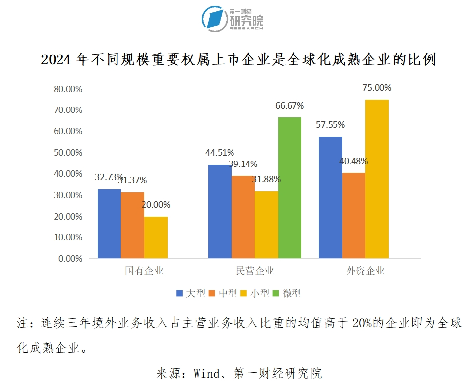 与此同时,数据显示,国有企业普遍到了一定规模后才会大力推进全球化。2024年,大、中型上市国有企业是全球化成熟企业的比例基本接近,为31%左右;而小型上市国有企业是全球化成熟企业的比例显著更低,仅为20.0%,对它们而言,海外市场的重要性相对不大。值得一提的是,对于本身即具有全球化基因的上市外资企业来说,小规模企业是全球化成熟企业的比重甚至高于大、中型企业,达到了75.0%。