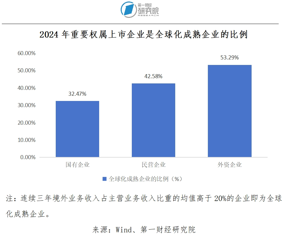 结合过去对中国企业全球化的研究,我们认为连续三年境外业务收入占主营业务收入比重均值高于20%的企业可以视作全球化已相对成熟的企业,以下简称为“全球化成熟企业”。基于这样的判断,数据显示,2024年,32.47%数据可得的上市国有企业是全球化成熟企业,民营企业该比重则达到了42.58%,外资企业该比重最高,超过了50%。这些数据显示相对较少比例的上市国有企业是全球化成熟企业。