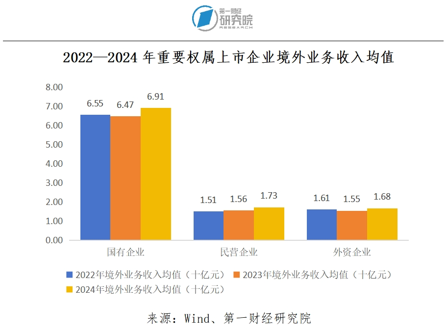 相比民营和外资企业,上市国有企业境外业务收入水平明显更高。数据显示,2022—2024年上市国有企业当年平均境外业务收入水平均超过了60亿元,而另两类权属的企业平均境外业务收入均不到20亿元。