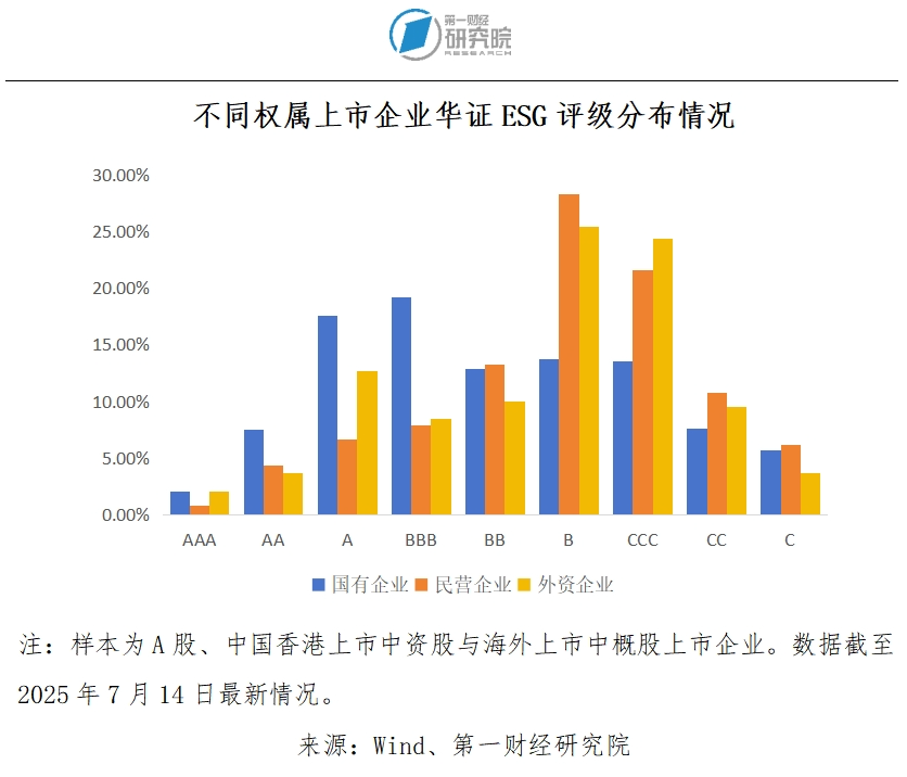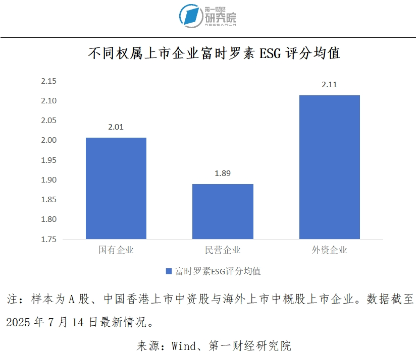 合规经营颇为重要,而这也是企业履行社会责任的一部分。普遍来说,较好地履行社会责任能够帮助企业在全球范围内建立信誉。国有企业经营的规范性相对较好,且较早就关注社会责任的履行。早在2008年国务院国资委即发布了《关于中央企业履行社会责任的指导意见》;2015年发布的《中共中央、国务院关于深化国有企业改革的指导意见》也提到,“社会主义市场经济条件下的国有企业,要成为自觉履行社会责任的表率”;2024年《关于新时代中央企业高标准履行社会责任的指导意见》发布,对中央企业履行社会责任提出了更高的要求。在这样的背景下,国有企业普遍积极地履行着社会责任。从华证ESG评级数据来看,2.06%被评级的上市国有企业获得了AAA(最高)级别,46.39%的国有企业被评为BBB级及以上,这两个比重均高于民营企业和外资企业。仅19.83%和26.98%的被评级上市民营企业和外资企业被评为BBB级及以上。从富时罗素ESG评分来看,满分为5分,上市国有企业的平均得分为2.01分,高于民营企业(1.89分)。积极履行社会责任直接支持着国有企业开展国际合作,推动企业全球化。