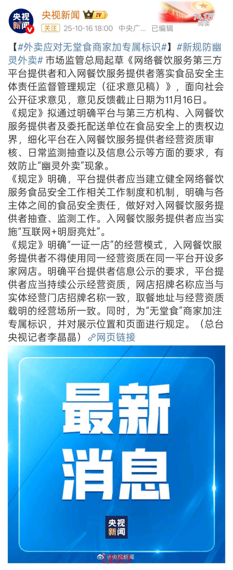 今年10月中旬,市场监管总局起草了《网络餐饮服务第三方平台提供者和入网餐饮服务提供者落实食品安全主体责任监督管理规定(征求意见稿)》,并面向社会公开征求意见。