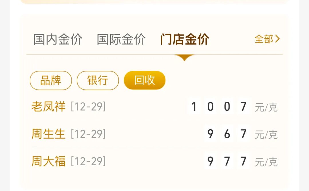 绍兴越城及柯桥区多家含有黄金回收业务的典当行,回收报价则相对低一些,29日回收金价基本都在1000元每克,而品牌回收金价则更低,如周大福29日回收价格在977元每克,其他品牌金店回收价格在967元到1007元每克不等。