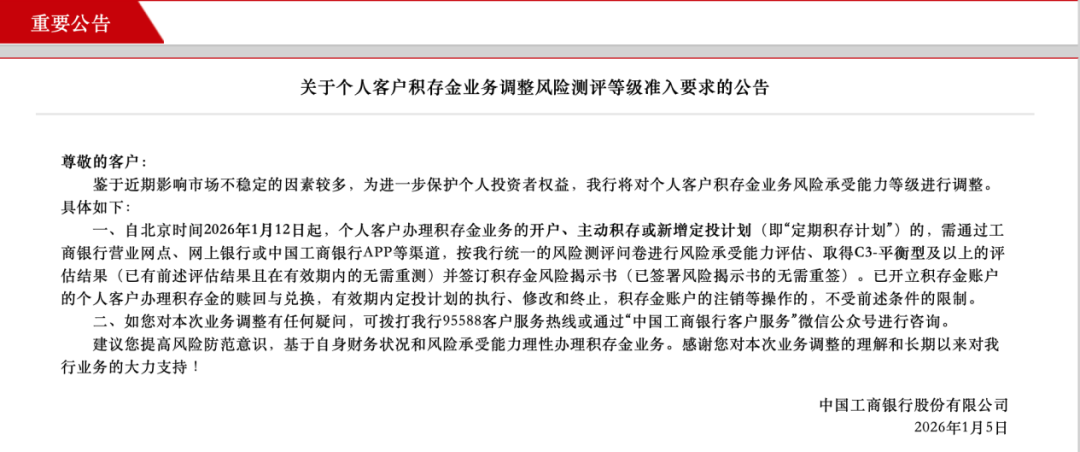 自2026年1月12日起,个人客户办理积存金业务的开户、主动积存或新增定投计划(即“定期积存计划”)的,需通过工商银行营业网点、网上银行或中国工商银行App等渠道,按该行统一的风险测评问卷进行风险承受能力评估、取得C3-平衡型及以上的评估结果(已有前述评估结果且在有效期内无需重测)并签订积存金风险揭示书(已签署风险揭示书的无需重签)。