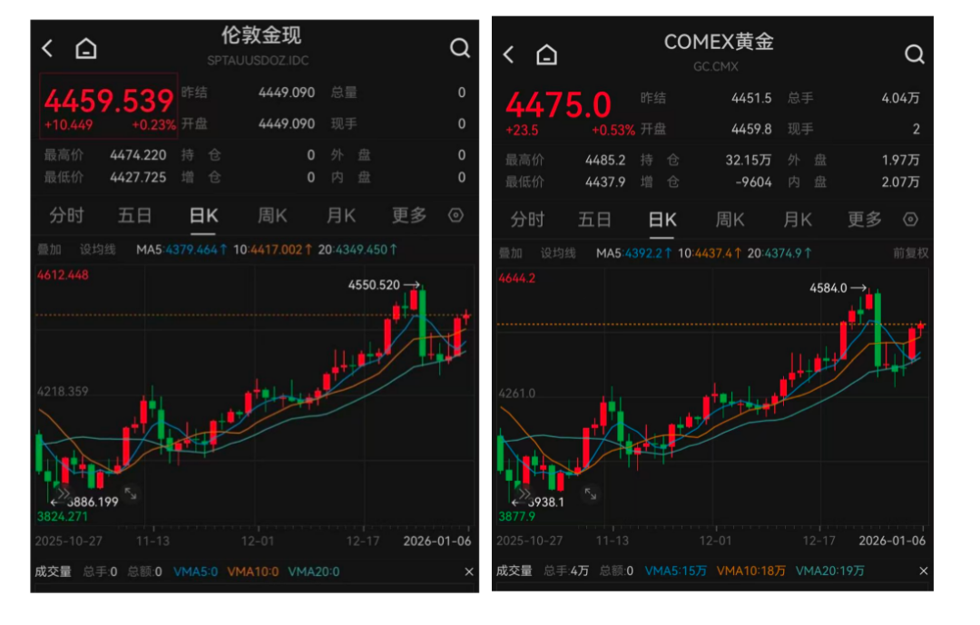 金价表现上,在经历去年末的短暂调整后,今年开年以来,国际金价再次震荡上涨。现货、期货黄金报价于1月5日双双回到4400美元/盎司之上。截至发稿,伦敦金报4459.539美元/盎司,上涨0.23%;COMEX黄金报4475美元/盎司,上涨0.53%。