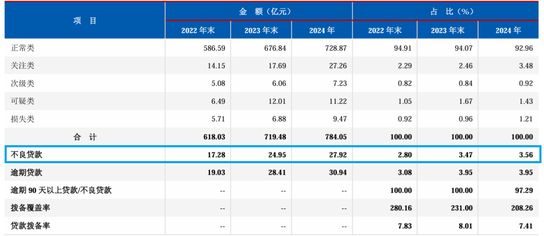 2022年至2024年,中银消金的不良贷款率从2.80%攀升至3.56%,不良贷款规模从17.28亿元增至27.92亿元,关注类贷款占比从2.29%升至3.48%,这三项指标均呈逐年攀升态势。