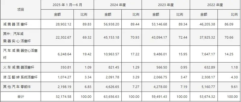 财报显示,2022年至2025年上半年,培源股份营收分别为5.51亿元、6.10亿元、6.52亿元、3.32亿元,归母净利润分别为6921.94万元、7582.00万元、5962.65万元、3469.51万元。其中,减震器活塞杆是培源股份的支柱型业务,收入占比超85%。