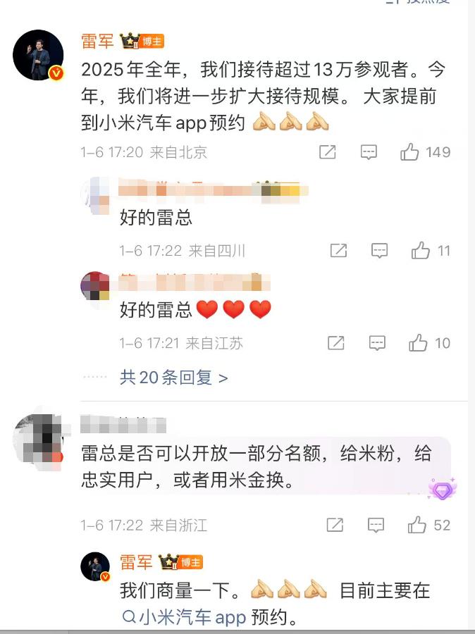 此外,有网友在评论区建议雷军开放部分小米汽车工厂参观名额,给小米的忠实用户等,雷军回应该网友,表示会商量一下。