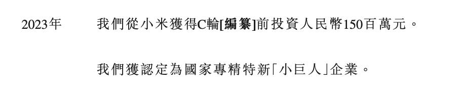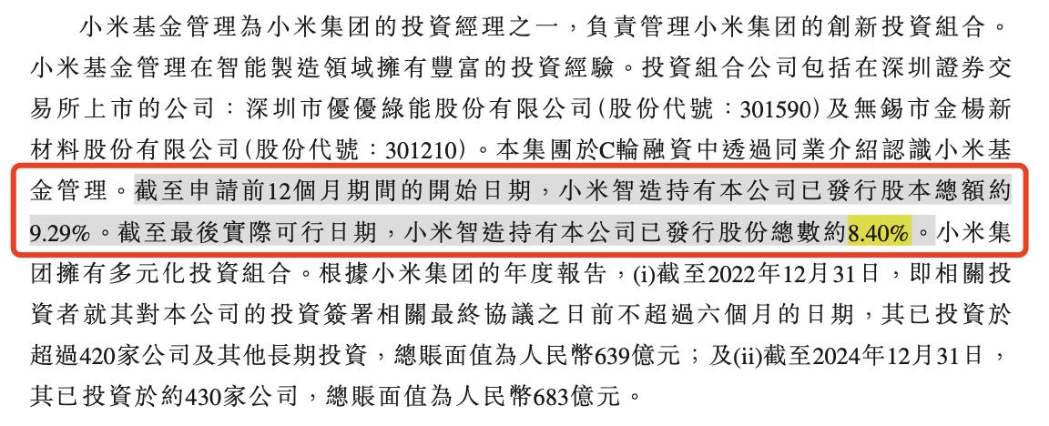 另外,2023年,公司从小米获得C轮前投资1.5亿元。截至申请前12个月期间的开始日期,小米智造持有公司已发行股本总额约9.29%。截至最后实际可行日期,小米智造持有公司已发行股份总数约8.40%。