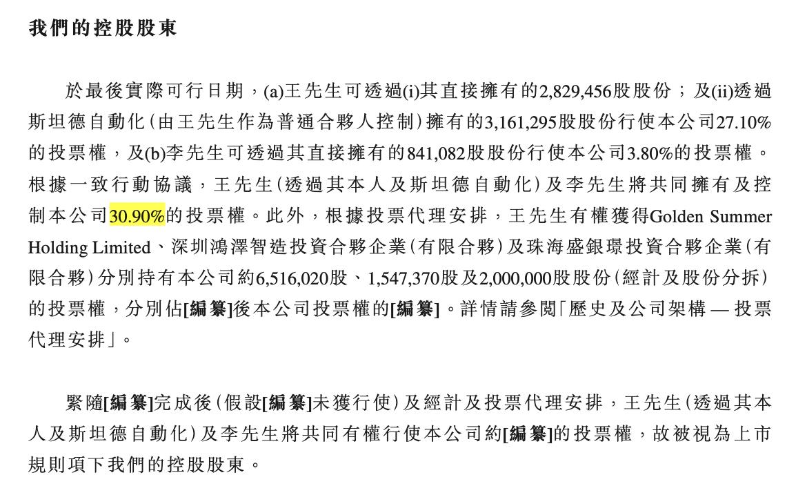 IPO前,王永锟可透过其直接拥有的2,829,456股股份;及透过斯坦德自动化(由王永锟作为普通合伙人控制)拥有的3,161,295股股份行使公司27.10%的投票权,及李洪祥可透过其直接拥有的841,082股股份行使公司3.80%的投票权。根据一致行动协议,王永锟(透过其本人及斯坦德自动化)及李洪祥将共同拥有及控制公司30.90%的投票权。
