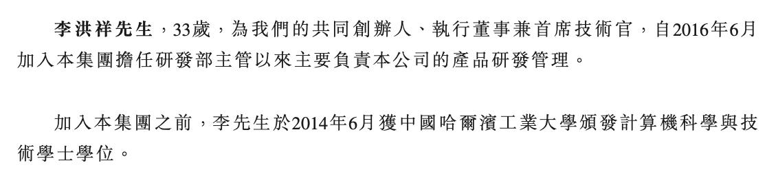 李洪祥,33岁,为公司的共同创办人、执行董事兼首席技术官,自2016年6月加入集团担任研发部主管以来主要负责公司的产品研发管理。
