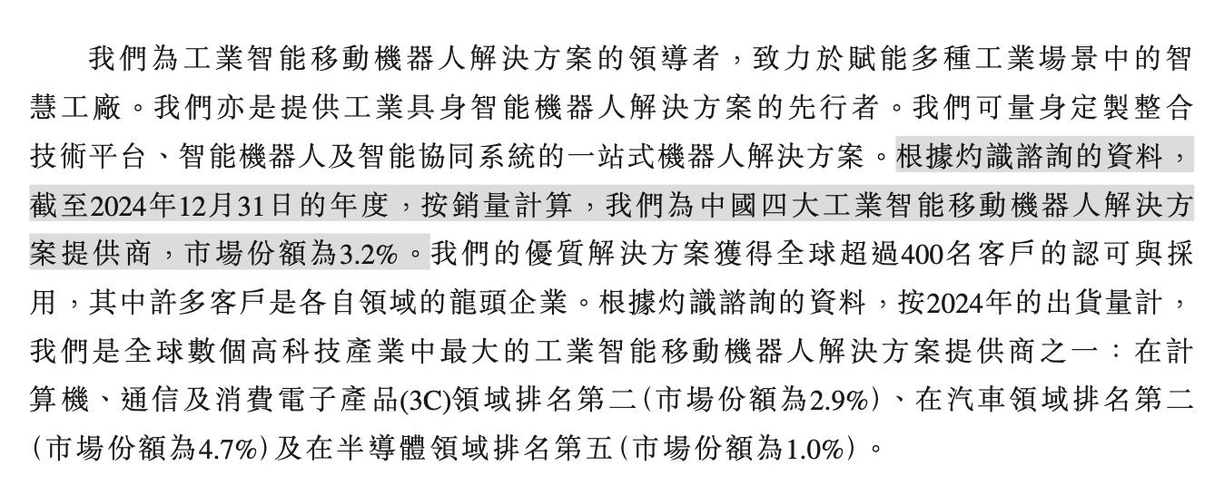 根据灼识谘询的资料,截至2024年12月31日的年度,按销量计算,公司为中国四大工业智能移动机器人解决方案提供商,市场份额为3.2%。其解决方案获得全球超过400名客户的认可与采用,其中许多客户是各自领域的龙头企业。