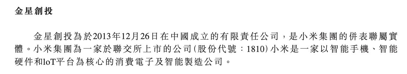 金星创投为于2013年12月26日在中国成立的有限责任公司,是小米集团的并表联属实体。小米集团为一家于联交所上市的公司(股份代号:1810)小米是一家以智能手机、智能硬件和loT平台为核心的消费电子及智能制造公司。