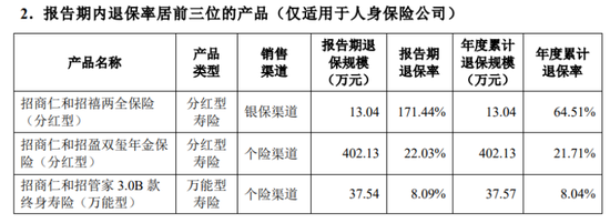 2025年第三季度,其退保率前三位的产品分别为招商仁和招禧两全保险(分红型)、招商仁和招盈双玺年金保险(分红型)、招商仁和招管家3.0B款终身寿险(万能型),期内退保率分别为171.44%、22.03%、8.09%,退保规模分别为13.04万元、402.13万元、37.54万元。
