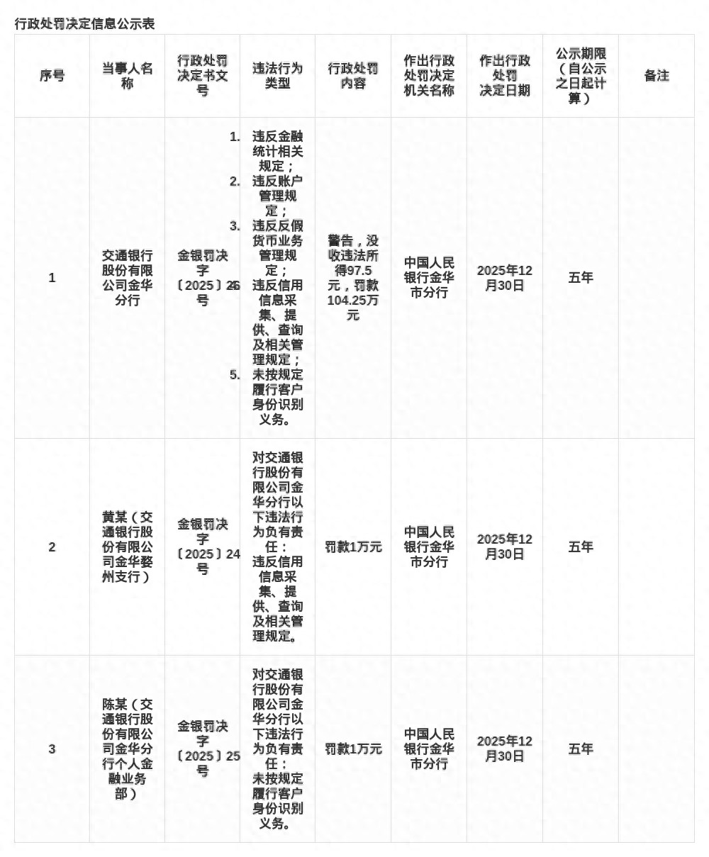 近日,中国人民银行金华市分行公布了多张罚单,剑指交通银行股份有限公司金华分行及其相关责任人。