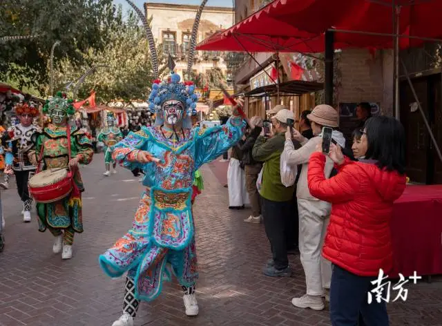 10月31日,“粤喀情”古城英歌舞队在演出,吸引沿街的商家和游客驻足欣赏。(资料图)