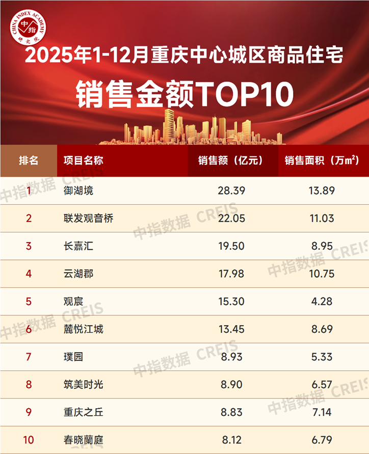 数据说明:重庆中心城区房地产企业销售数据统计是以2025年1月1日至2025年12月31日期间销售的商品房为统计口径,主要依据中指数据CREIS(点击查看)在重庆中心城区的销售监测数据。本报告仅供参考,课题组不对使用报告及其内容所引发的任何直接或间接损失承担责任。