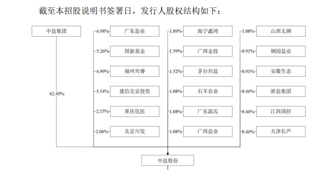 截至本招股说明书签署日,中盐集团直接持有中盐股份22.95亿股股份,持股比例为62.49%,为公司的控股股东、实际控制人。中盐集团由国务院国资委持股90%、全国社会保障基金理事会持股10%。