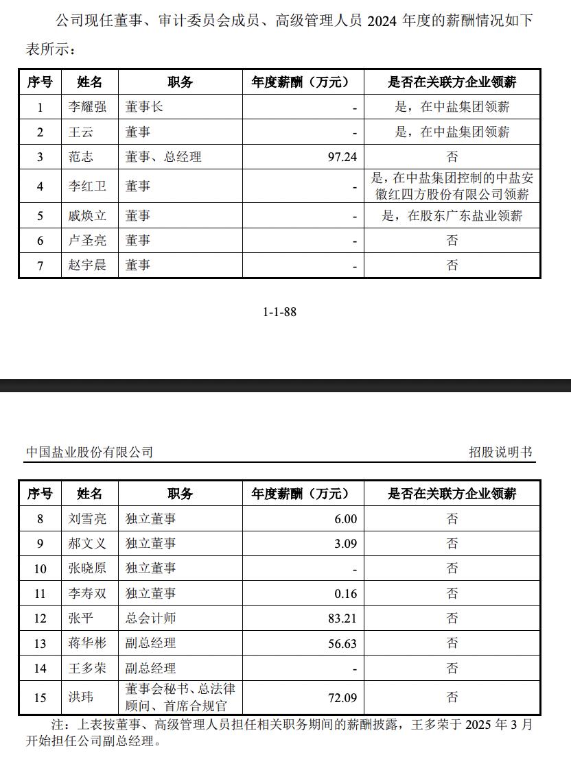 薪酬方面,2024年度,范志在中盐股份获得薪酬为97.24万元。李耀则在中盐集团领薪,