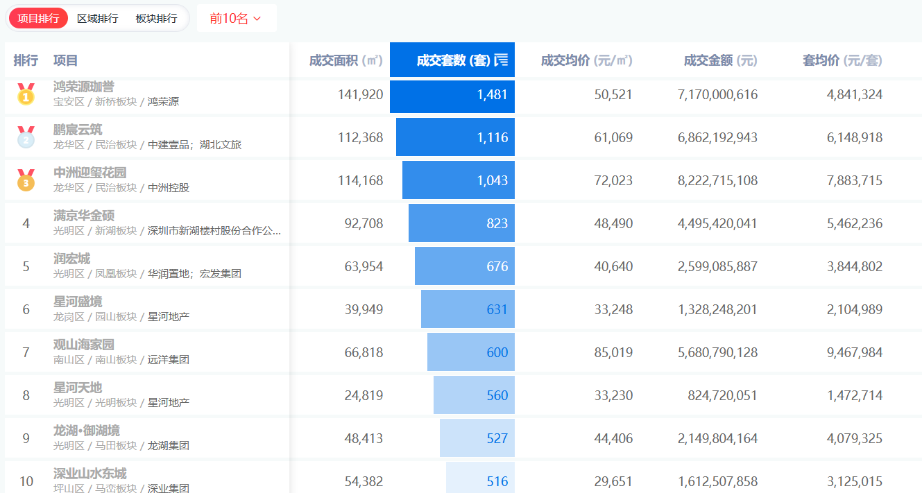 成交套数TOP,冠军、亚军、季军分别是鸿荣源珈誉、鹏宸云筑、中洲迎玺花园。