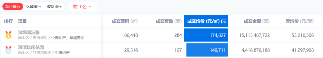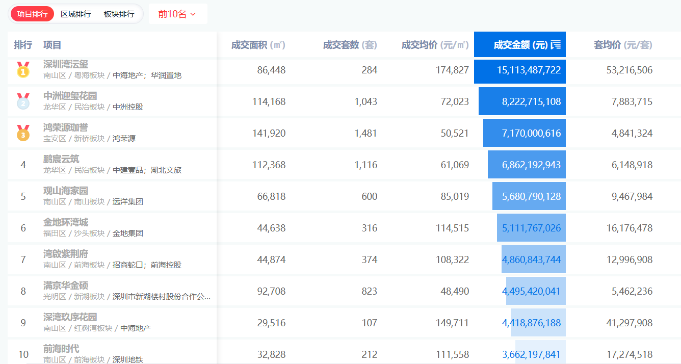 成交金额TOP10,南山区独占鳌头,有五个楼盘上榜。