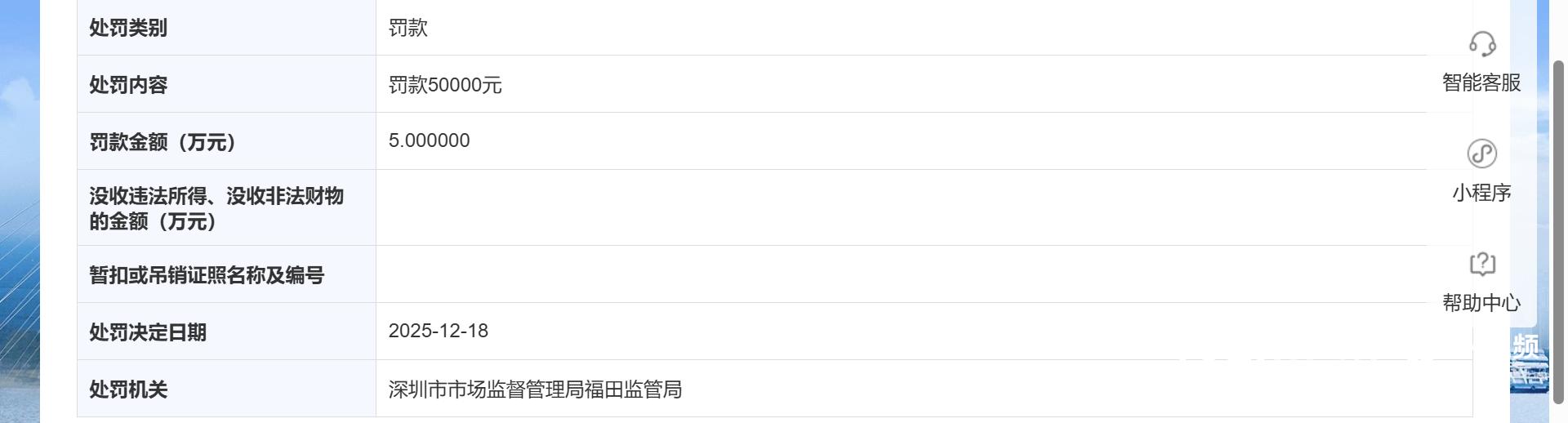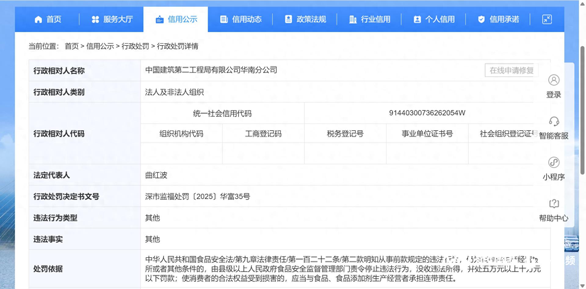 奥一新闻从“信用中国(广东)”官网获悉,近日,深圳市市场监督管理局福田监管局,对中国建筑第二工程局有限公司华南分公司作出人民币5万元的行政处罚。