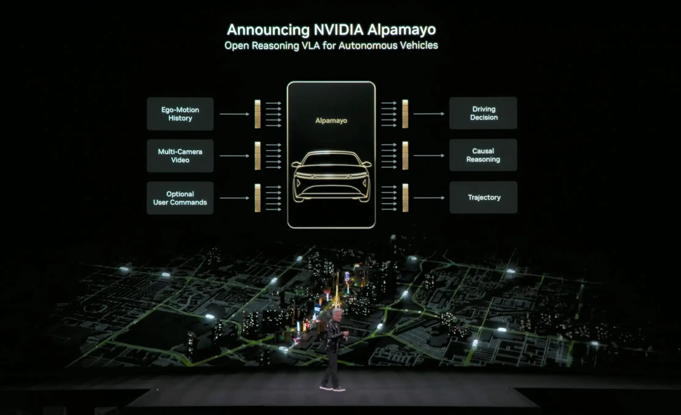 在开始演讲之前,英伟达便在社交平台表示,「本届CES不会发布新的GPU产品」,这是五年来,英伟达首次打破CES发硬件新品的惯例,把所有焦点都集中到了自动驾驶、物理AI的软件与系统能力上。而黄仁勋带来的「杀手锏」,正是首款面向自动驾驶场景的开源物理AI推理模型Alpamayo。