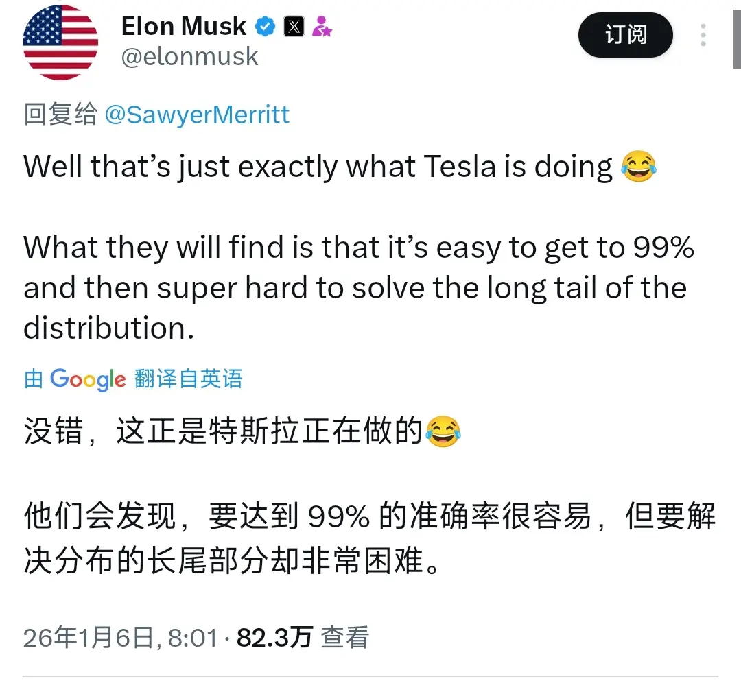 作为自动驾驶赛道的「老对手」,特斯拉创始人马斯克也第一时间对英伟达的这一系列动作作出回应:「好吧,这正是特斯拉在做的。他们会发现,达到99%很容易,但要解决分布的长尾问题却非常困难。」
