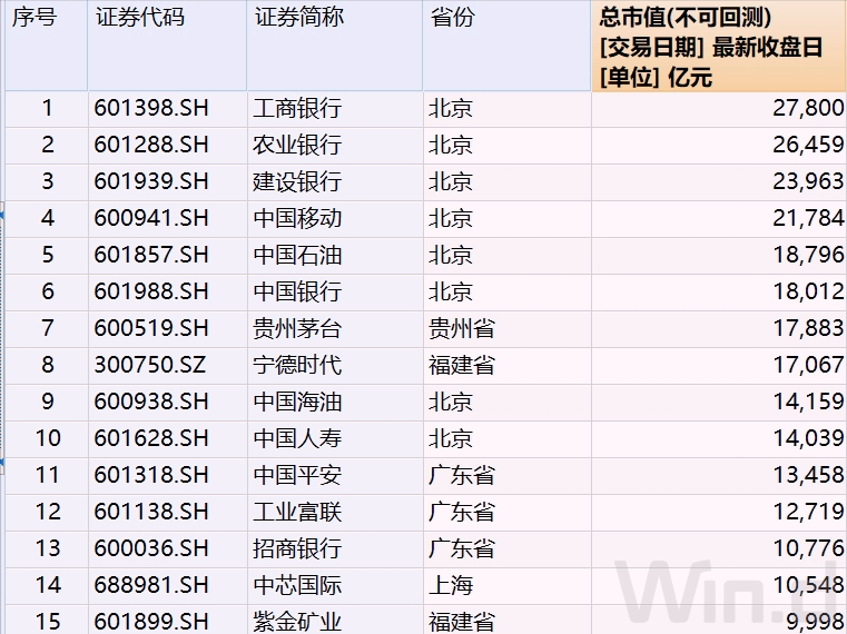 贵州和上海各有一家,其余万亿市值以上企业在北京,毕竟四大行和巨无霸央企注册地都在首都。