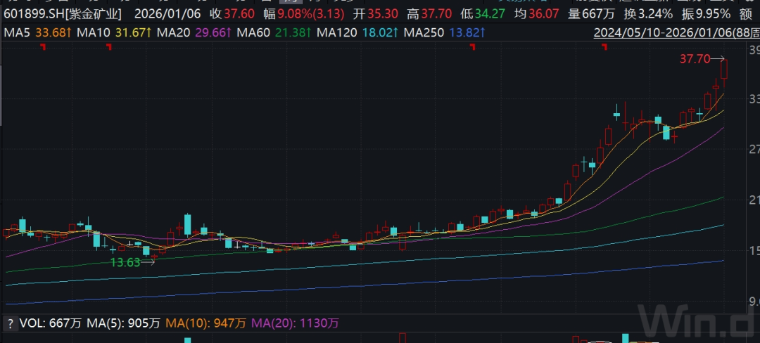 黄金价格在2025年大涨,2026年开年后上涨脚步停不下来,是紫金矿业股价持续大涨的内在动力。