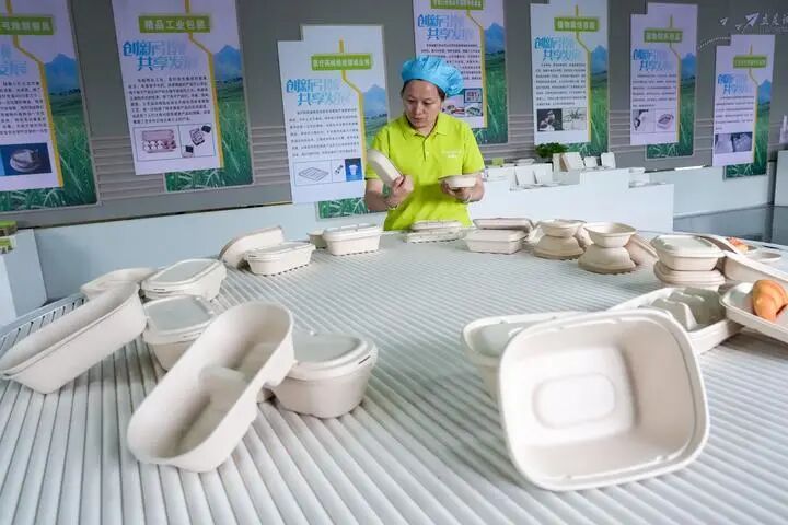 2025年4月15日,工作人员在位于云南省临沧市耿马傣族佤族自治县的绿赛可新材料(云南)有限公司产品展厅查看展出的可降解餐具产品样本。该地区依托40万亩甘蔗种植的产业基础,将榨糖产生的废弃物甘蔗渣转化为环保可降解餐具,兼具实用性与生态价值。餐具以甘蔗渣天然纤维素为原料,可在自然环境中完全降解,有助于减少塑料污染。