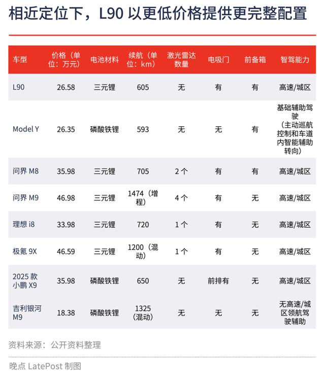 L90 上市后,2025 年下半年国内密集上市了一大批“5326”SUV(即车长 5 米,轴距 3 米、车宽 2 米以上的六座及以上大型 SUV),包括但不限于:吉利 M9、蔚来 ES8、腾势 N9、领克 009、深蓝 S09、问界 M9/M8、理想 i8、岚图“泰山”、极氪 9X 等。