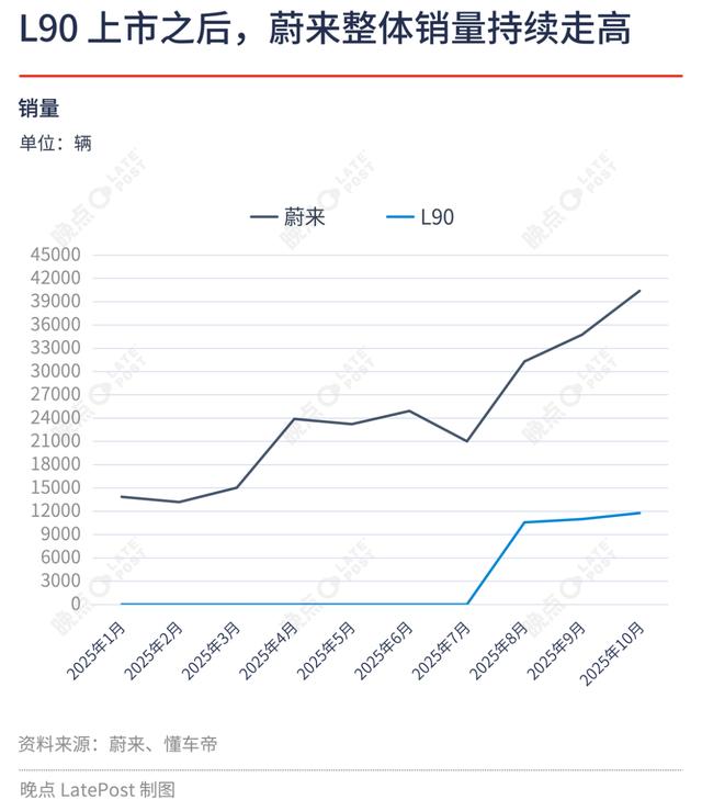 凭借极高的性价比,L90 成功一个短暂的市场空档—— 30 万元以内的纯电大六座 SUV。它首个完整交付月数量即破万,占同期蔚来销量近三分之一,托住了急坠中的蔚来。