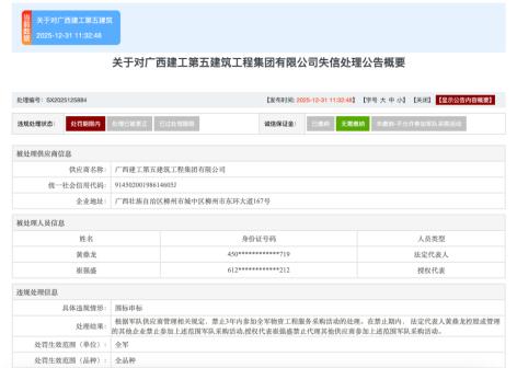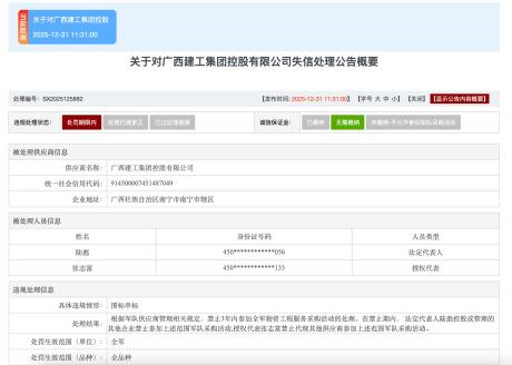 近日,军队采购网发布公告,广西建工集团控股有限公司在军队采购活动中存在围标串标等违规行为。根据军队供应商管理相关规定,自2025年12月31日起算,3年禁止全军物资工程服务采购活动的处罚。