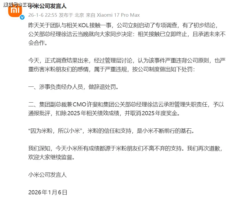 从事件发酵到公布结果,短短一天内,小米就果断终止了与涉事博主的合作,随后24小时内更公布了一份极具警示意义的内部分处理结果。