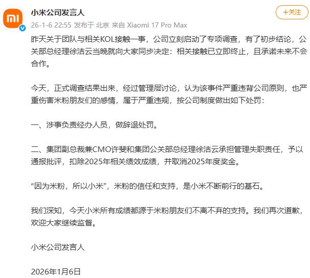 小米通报:涉事负责经办人员辞退,集团副总裁兼CMO和公关部总经理通报批评、扣除2025年相关绩效并取消年度奖金