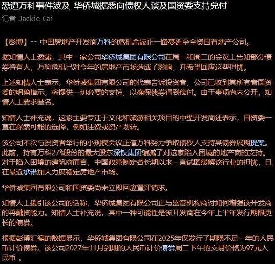 此次事件的核心信息源头为彭博社2026年1月6日发布的专项报道,该报道基于华侨城集团与债券持有人的闭门会议实录,披露了三大核心要点,且后续经多个权威媒体转载核实,信息真实性得到多方印证。