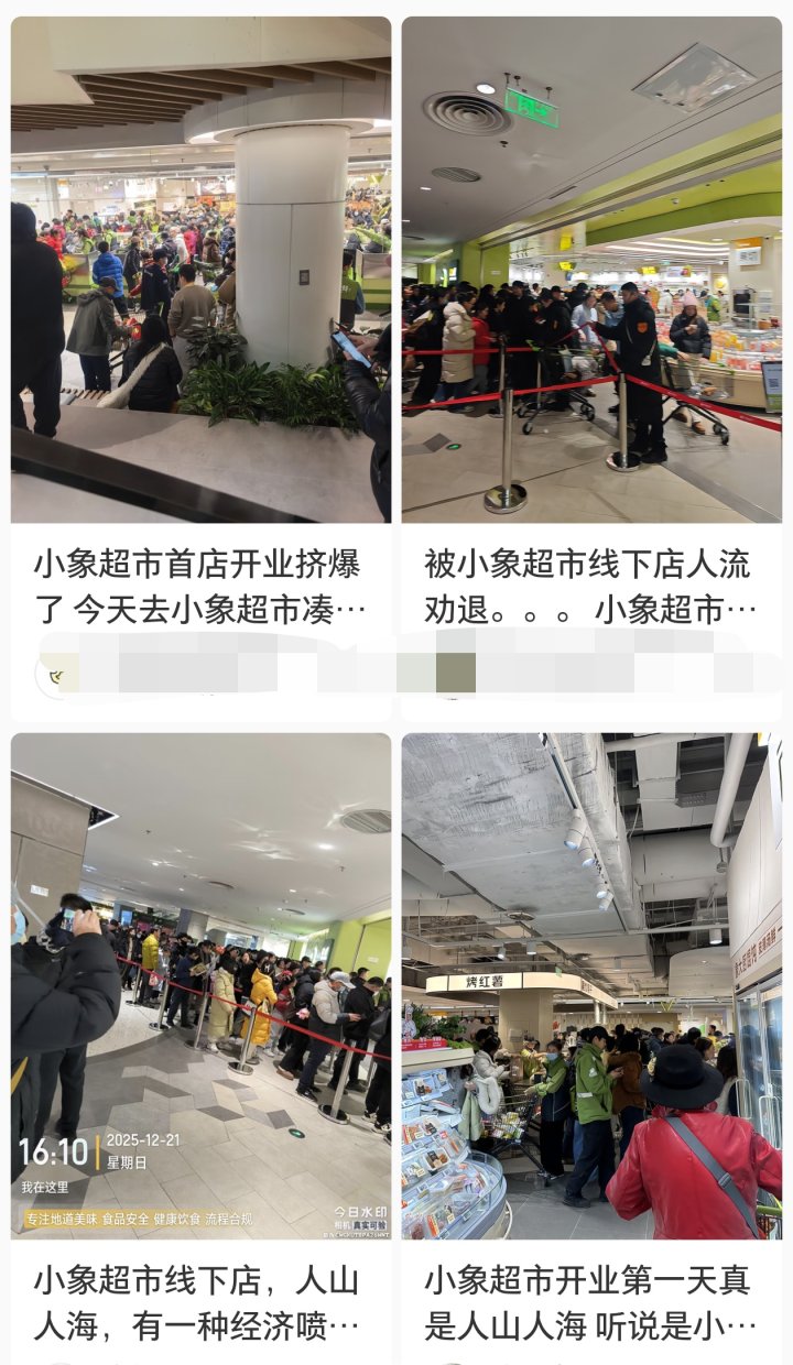 12月17日,京东折扣超市北京首店在门头沟西山荟购物中心正式开业,仅两天后,12月19日美团旗下新零售品牌“小象超市”全国首店亮相北京华联万柳购物中心,开业现场人山人海。而除了电商平台外,传统零售巨头动作也不少,沃尔玛在深圳连开4家社区折扣店,盒马“超盒算NB”在全国加速扩张,奥乐齐、折扣牛等专业品牌也持续深耕。