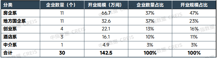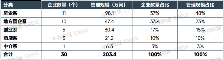分类来看,管理榜TOP30中,分别有11家房企系住房租赁企业、10家地方国企系、5家创业系、3家酒店系、1家中介系。与开业榜类似,房企系管理规模保持领先优势,合计占比达48%;地方国企系管理规模实现较快增长,合计占比达23%,占比较2024年末提升3个百分点。