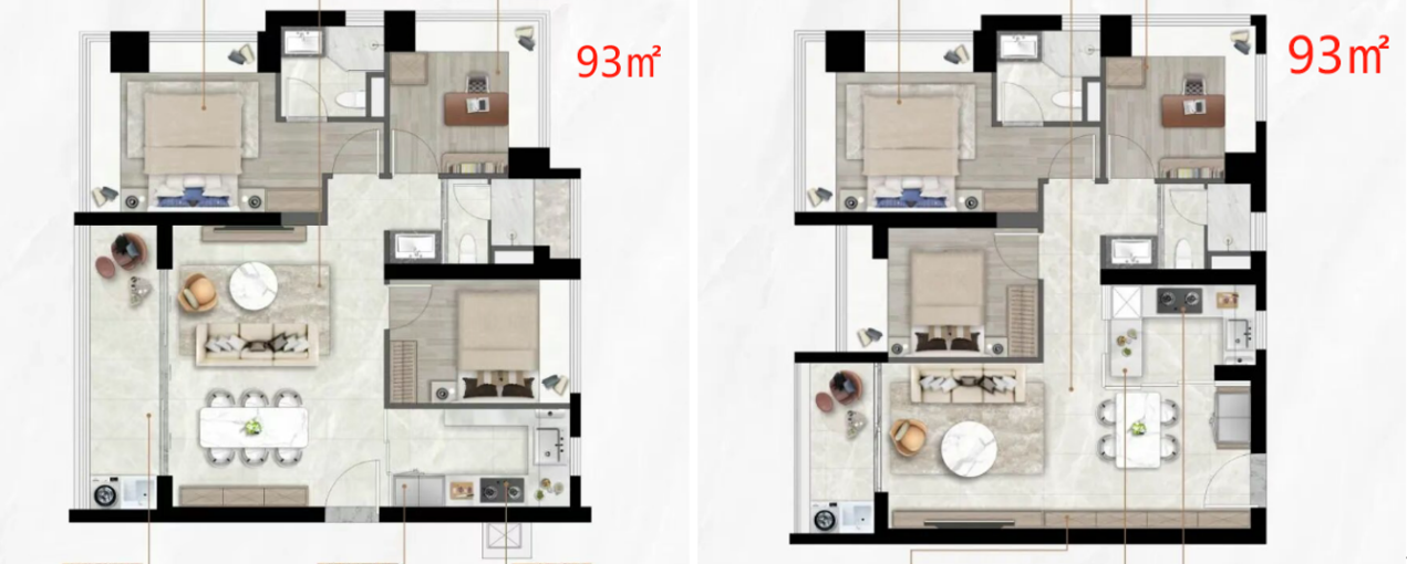 93㎡为3房2厅2卫,有横厅和竖厅两个户型;