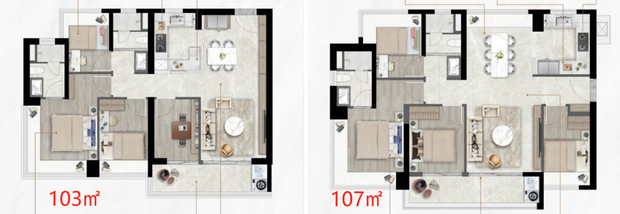 103、107、126㎡为4房2厅2卫设计,竖厅户型;