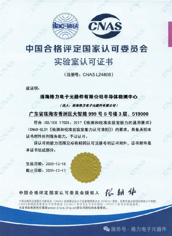 近日,中国合格评定国家认可委员会(CNAS)正式通知,珠海格力电子元器件有限公司半导体检测中心成功获得CNAS实验室认可证书(注册号:CNAS L24808),标志着该中心在半导体检测领域的技术实力与实验室管理水平获得国家级权威认证,与国际标准全面接轨。