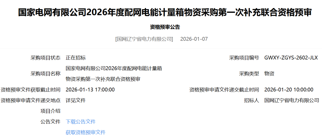 国家电网有限公司2026年度配网电能计量箱物资采购第一次补充联合资格预资格预审公告