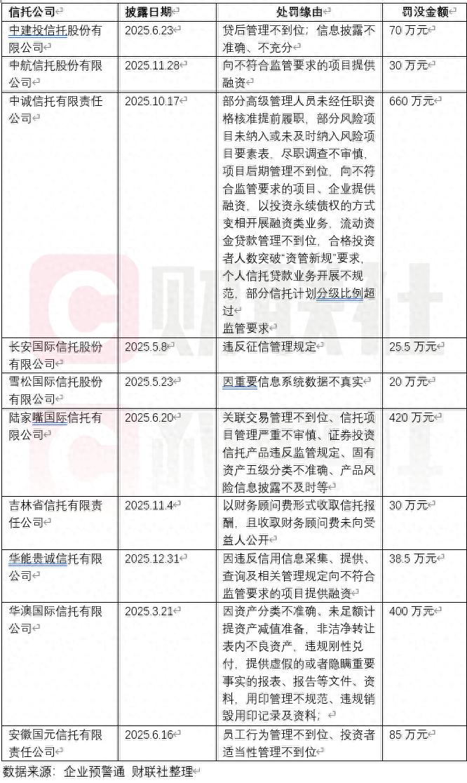 以下是财联社根据企业预警通数据整理出的2025年受到罚款处罚的部分信托公司数据: