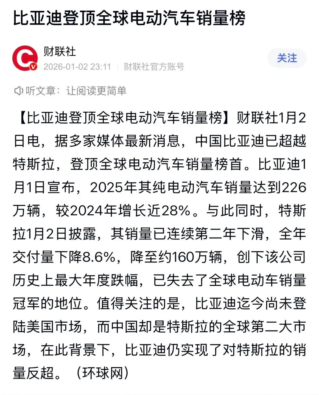 2025年,特斯拉销量大跌,电动汽车销量甚至被比亚迪超越,失守全球第一的宝座。