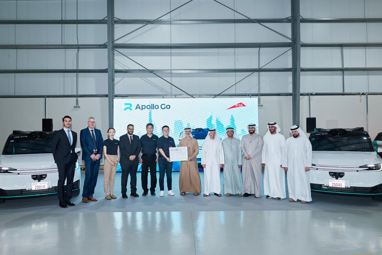 图为迪拜道路与交通管理局为中国科技企业百度旗下的无人驾驶出行服务平台“萝卜快跑”颁发全无人驾驶测试许可活动现场(百度公司供图)