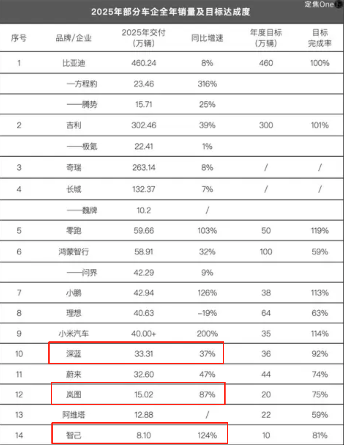 图/2025部分车企销量及目标达成度来源/定焦One